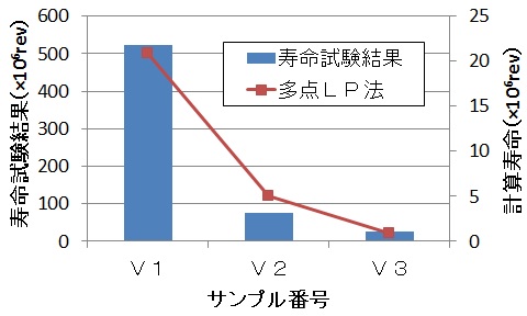 図3の結果を用いて、多点LP法による転がり疲労寿命計算を行った結果を実験結果とともに図4に示します。