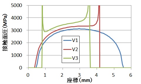 図より、V2では肩乗り上げが生じて、接触面圧が約4.1mm位置で上昇していることがわかります。また、V3では、左側の溝にも乗り上げていることがわかります。