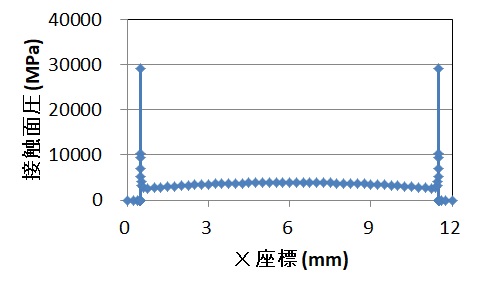 (補足)図4では、ころ端部(X=0.5,11.5)での細メッシュが応力ピーク値を捉えていないように見えますが、点が重なっているためであり、十分にピークを捉えています。