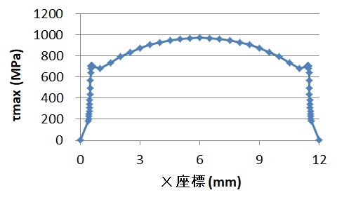 yz平面でのτyzの最大値である「τmax」をプロットした図4では、エッジ部の値が、それほど大きくないことから、図3のエッジロードはそれほど大きくないと言えます。