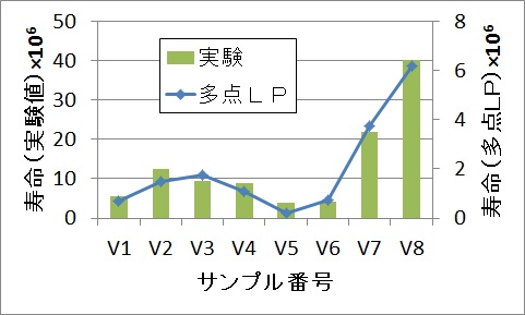 図2 多点LP法による転がり疲労寿命計算結果と実験結果(事例c3より)