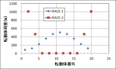 図2から、RACE-1では、11番の転動体、RACE-2では、1番または20番の転動体が最大の荷重を受けており、RACE-2の方が大きな荷重を受けていることがわかります。