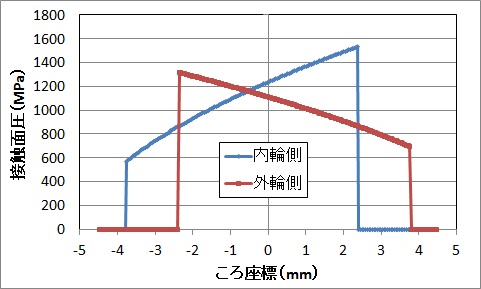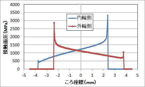 一方、図5のEPC法で計算すると、転走面端部両側で、特に内輪外径または外輪内径で大きなエッジロードが発生していることがわかります。(ころ全長は10mmであり、チャンファ部を除外した、ころ有効長さは±4.5mmです。転走面溝底のヌスミもあり、ころ端部両側とも、転走面と接触していません)。