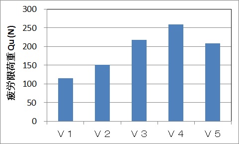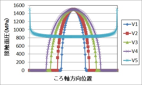 表1に示すように、クラウニング形状はV1〜V5に代表される5種類であるため、接触面圧が1500MPaとなる疲労限荷重も5種類となります。図2は、V1〜V5の疲労限荷重、図3は疲労限荷重時の接触面圧分布を表したものです。