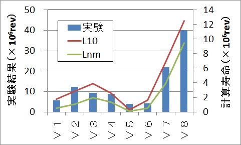 修正定格寿命Lnmの計算は、従来の基本定格寿命L10に対して、図5のaISO値を乗じて算出しているため、aISOの傾向からV1〜V5における寿命最大値はV3,V4寄りに移動していると考えられます。実験ではV1〜V5における最適なクラウニングRはV2〜V3の間にあると記載されていますが、修正定格寿命を用いて最適クラウニングRを求めると、実験結果から外れる方向に最適クラウニングRが移動していることになります。
