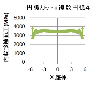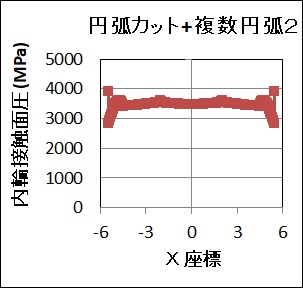 「対数クラウニング」は、ほぼフラットな面圧分布になっていますが、最端点での面圧低下が、最適値としては不十分であると考えられます。「円弧カット+複数円弧2個」や「円弧カット+複数円弧4個」は、図3(1)の「フルクラ」「円弧カットクラ」「直線カットクラ」と比べると、かなりフラットになっており、寿命が改善されている様子がわかります。ただ、端部領域で面圧低下が生じており、この点の改善が必要ですが、改善のために円弧の半径を大きくするとエッジロードが大きくなり寿命は悪化してしまうため、円弧クラウニングではやむを得ない現象であると考えられます。ただ、最端部の面圧は約4000MPaで、「対数クラウニング」が約1000MPaであるため、これよりはフラットになっており、この点は良い方向になっていることがわかります。