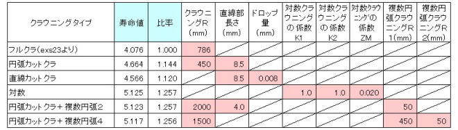 (補足)最適値探索計算では、「真の最適値は何か」という命題に対する解はありません。その理由は、探索結果が得られても、見つかっていない解が存在することもあり、得られた解が真の最適値であるかどうかを証明することが難しいからです。このため、本事例で得られた寿命値を比較して、どのタイプのクラウニングが優れているかを決定することは必ずしも正しいとは言えませんが、概略の傾向は見えてくると考えます。