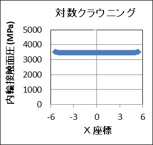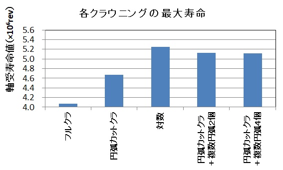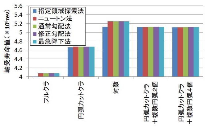 事例s24では、6種類のクラウニングタイプに対して、@できるだけ早く設計を完了させること、A使用可能で、かつ、かなり良い解を得ること、という前提で、指定領域探索法にて、軸受寿命を最大にする最適クラウニング形状を計算しました。(荷重:13720N,