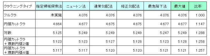 各クラウニングタイプと各探索法の組合せによる最適値探索結果を表1に、この結果を図2にグラフで示します。指定領域探索法の結果は事例s24からの転記です。また、フルクラウニングの修正勾配法の値は事例s23を転記したものです。また、実験結果より、最適解の範囲がわかっているため、フルクラウニングでの指定領域探索法による広域探索は実施していません。