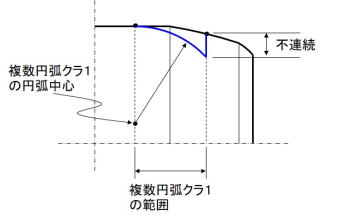 但し、直線部と円弧状カットクラの接合部(複数円弧クラ1の両端部)が、なめらかに接続するように、複数円弧クラの自動接続機能を使用します(直線部と円弧状カットクラ部が滑らかに接続するように、複数円弧クラの中心位置を自動設定する機能で、中心位置がどこであるかは、出力されます)。この機能を使わない場合、複数円弧クラ1の位置が直線部と連動して正しい位置に設定されても、複数円弧クラ1の円弧半径Rが適切でないと円弧状カットクラウニング部との接続部で不連続になってしまいます(図1)。複数円弧クラ1の円弧半径Rが最適値の場合は、滑らかに接続すると思われますが、不適切な場合は無駄な計算になってしまうため、この自動設定機能を使用します。