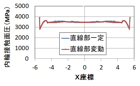 最大軸受寿命を与える最適値探索結果を、事例s24(直線部一定)と比較して、表1に、最大寿命値での接触面圧グラフを図3に示します。表1で、両者の寿命値を比較すると、直線部変動時の方が寿命が長くなっており、直線部長さを変動させた効果が出ていますが、その効果は0.2%(表中の比率欄参照)という、極くわずかな向上にとどまりました。