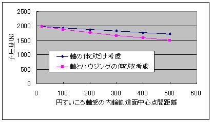 予圧量はスパン500mmのとき、当初2000Nあったものが、軸とハウジングの伸びを考慮すると、1500N近くにまで低下することがわかります。
