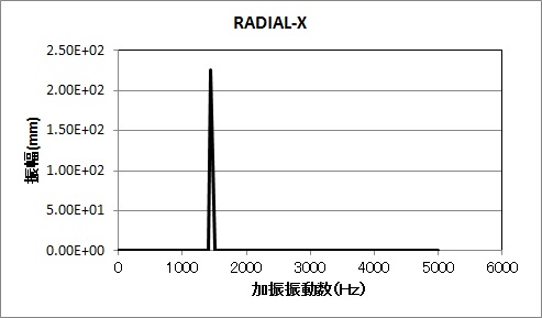 共振点は1439Hzでした。振動モードは図3のように、ラジアル方向の平行変位でした。(軸受部減衰を考慮していないため、非常に大きな変位となっています)