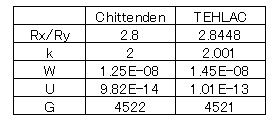 論文中の Fig.5 の入力値として示されているのは、EHLパラメータ(U,W,G)と、物体半径比(Ry/Rx)、接触楕円の縦横比(k=a/b)だけで、正確な入力値はわかりません。わかっているものついて比較して、下表に示しますが、これらに関しては、両者はかなり良く一致していると言えます。