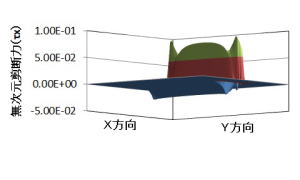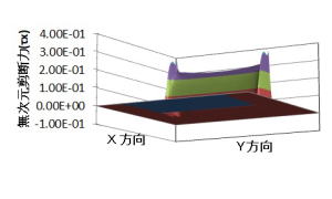 式(1)より、剪断力は、物体表面の粘度と速度勾配の積であり、概略の傾向として、図7より、剪断力は油膜前方部ではなく、油膜中央部であるX=0,Y=0の位置近傍で大きくなっていることがわかりました。また、X=,Y=0位置での、速度勾配の代用値である速度差は