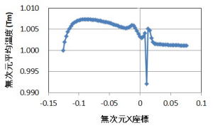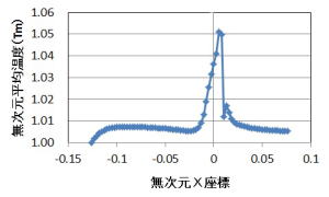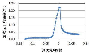 一般に、すべり率によって面圧 p はあまり影響されないため、式(3)では温度変化が重要になります。油膜内部の平均温度Tm(油膜厚さ方向の平均値)は、TEHLACから得られ、Y=0の位置でプロットすると、図10のようになっています(目盛に注意)。