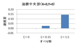 次に、油膜中央部である X=0,Y=0 の位置で比較します(図8の右側グラフ参照)。物体表面での速度勾配はほぼゼロまたは正の値を示しており、すべり率